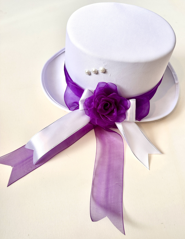 Bílý cylindr symbolizuje čistotu a slavnostní atmosféru svatebního dne, zatímco fialová mašle dodává dekoraci barevný akcent. Růžička s drobnými perličkami celek zjemňuje a vytváří harmonickou dekoraci, která nepůsobí rušivě, ale přirozeně doplní svatební výzdobu. |