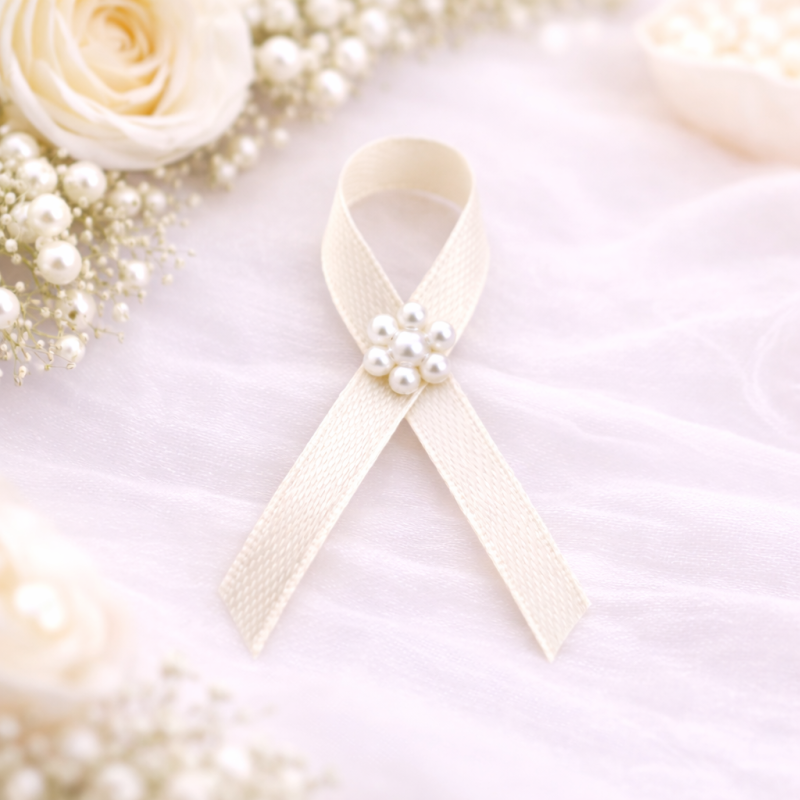 Vývazek je vyroben ze saténové stuhy v krémové barvě, která je složena do klasického tvaru mašličky. Uprostřed je zdoben jemnou kytičkou z perliček, která dodává vývazku elegantní a slavnostní vzhled. Krémová barva je nadčasová a velmi univerzální – skvěle se hodí pro klasické, rustikální i přírodní svatby. Vývazek je připraven k okamžitému použití – špendlík pro uchycení je jeho součástí. |