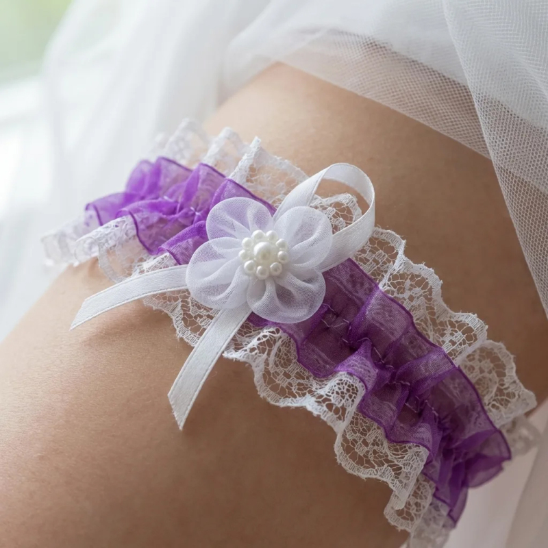 Elegantní svatební podvazek s jemnou krajkou a průsvitnou fialovou stuhou je krásným symbolem svatební tradice. Romantický květ s perličkami a bílá mašle dodávají doplňku něžný a slavnostní vzhled, který perfektně doplní svatební šaty. |