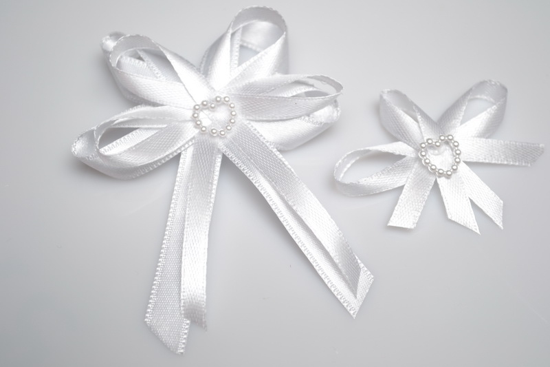 Vývazek je vyroben z bílé saténové stuhy tvarované do elegantní mašle. Uprostřed ho zdobí jemné perleťové srdíčko, které dodává celému vývazku romantický a slavnostní vzhled. Menší varianta (5 × 4 cm) je určena pro běžné svatební hosty, větší varianta (7 × 6 cm) s bohatší mašlí a delšími stuhami pak pro svědky a rodiče novomanželů – na svatbě se tak krásně odliší od ostatních. Díky neutrální bílé barvě se obě velikosti hodí ke každé svatební výzdobě a barevné tématice. Špendlík pro připnutí na oděv je již součástí každého vývazku. |