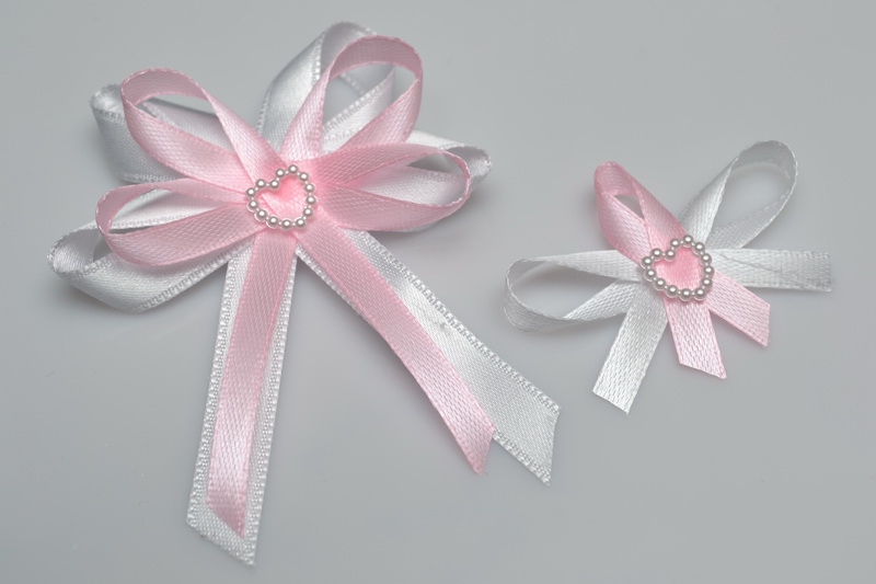 Saténové vývazky se špendlíkem, ve stejném designu jak pro hosty (menší 5x4 cm) tak pro svědky a rodiče (větší 7x6 cm).