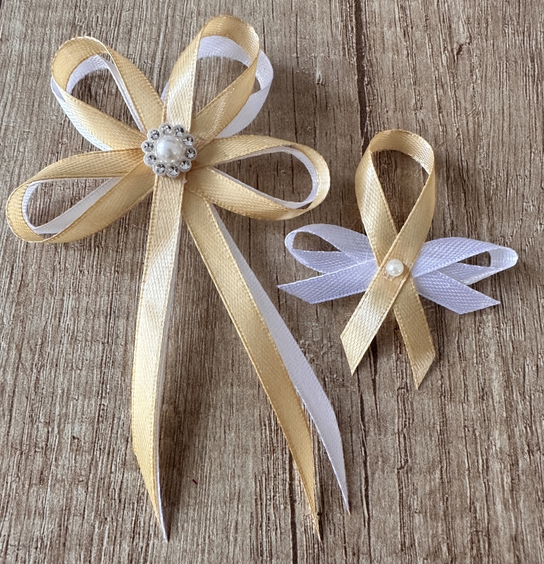 Saténové vývazky se špendlíkem, ve stejném designu jak pro hosty (menší 5x4 cm) tak pro svědky a rodiče (větší 7x6 cm).