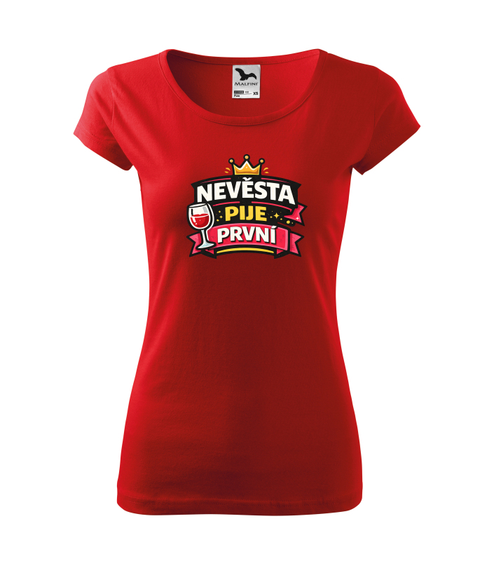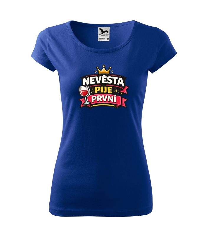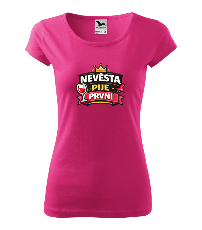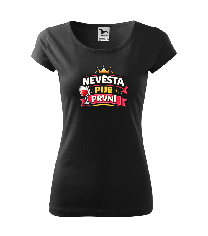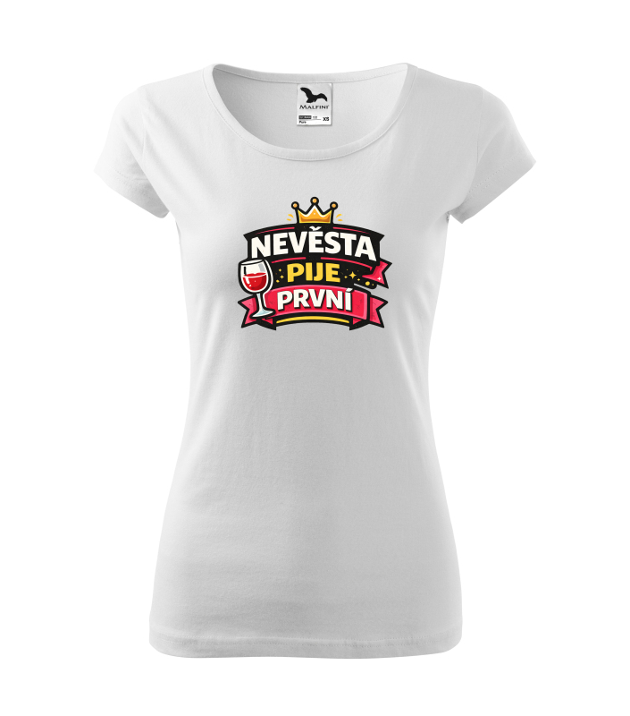 Tričko s nápisem „Nevěsta pije první“ je ideální pro nevěstu, která chce svou rozlučku oslavit s humorem a stylem. Výrazná grafika s korunou a skleničkou dodává tričku veselý charakter a skvěle doplní outfit celé skupiny kamarádek. |