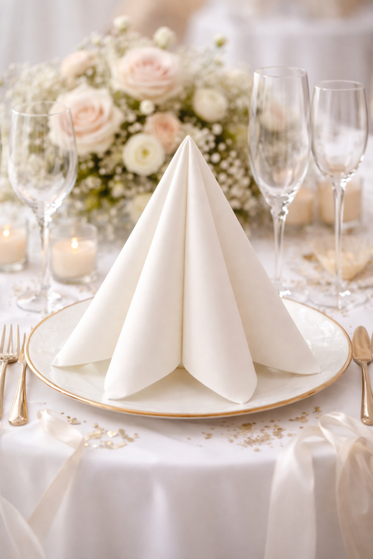 Ubrousky doporučujeme sladit s běhouny na stůl, jmenovkami, svatebními menu kartami nebo svícnem ve světlých tónech. Vznikne tak harmonická a elegantní tabule, která na fotografiích působí čistě, promyšleně a nadčasově.