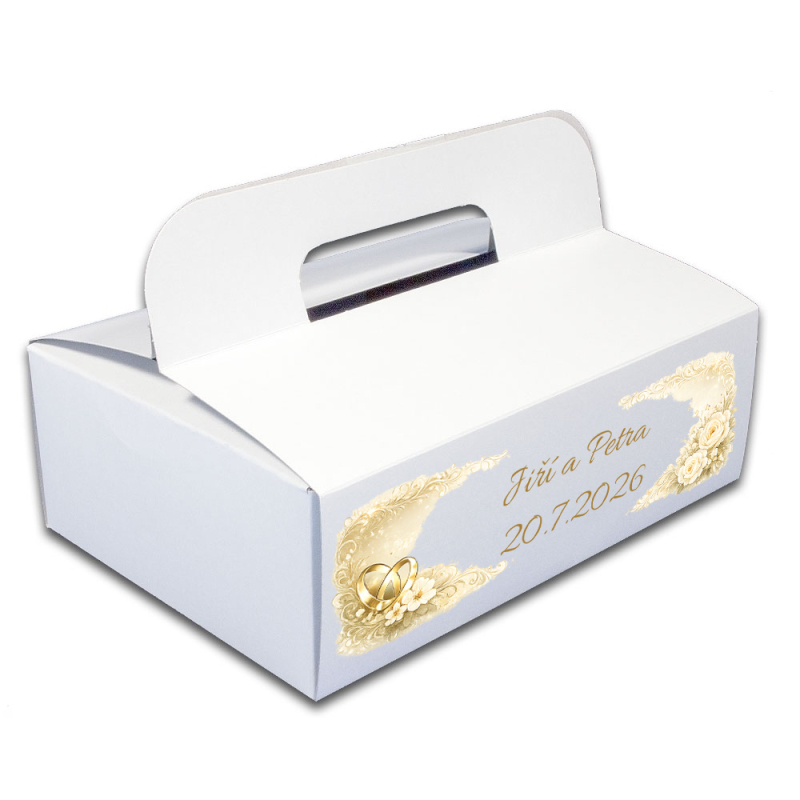 Motiv propojených prstýnků jemně připomíná okamžik, kdy si novomanželé řekli své „ano“. Doplnění jmen a data svatby dělá z krabičky osobní památku, která zůstane hostům jako vzpomínka na slavnostní den. |